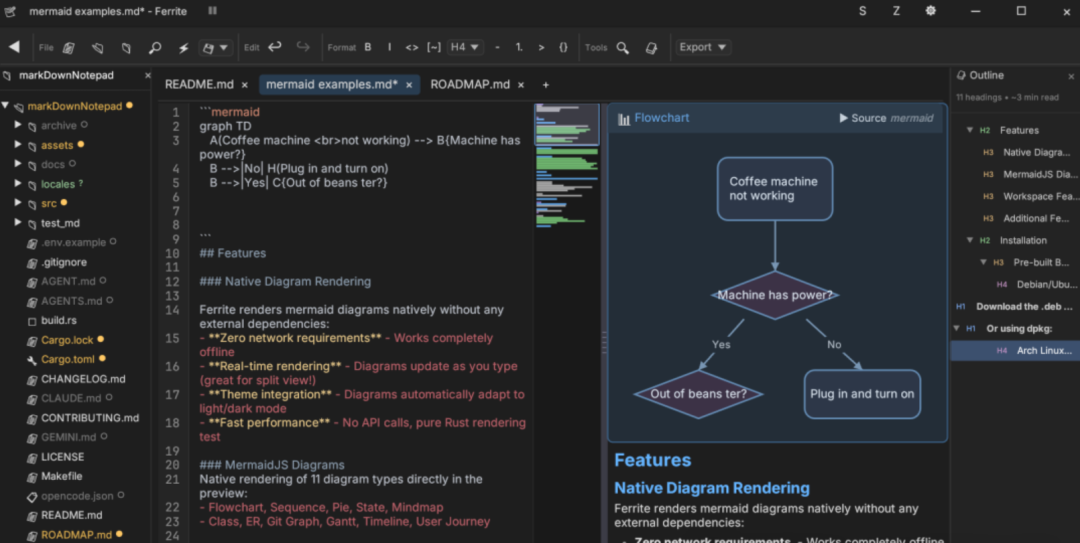 Ferrite 是一款免费开源的高性能轻量级文本编辑器,支持 Markdown、JSON、YAML 以及 TOML 文件格式。